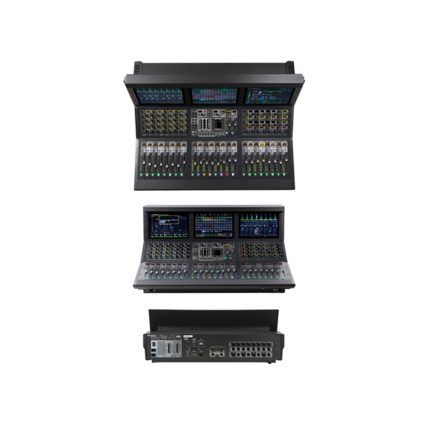 | Technical specifications | 12-inch daylight-visible touchscreens : 1 Master Touchscreen, 2 Channel Touch Modules Faders : 24 + 2 Knob Modules with high-resolution OLEDs and tri-color function indicators : 64 assignable knobs across 2 Channel Knob Modules Master Live Module : Graphic TFTs with soft buttons; Touch and Turn assignable encoder; 2 assignable faders; monitoring, layout and snapshot controls; transport controls and function buttons Metering : 30-segment meters per channel, with pre- and post-fade metering options; Nominal indicator, Expander/Gate status and Compressor/Limiter gain reduction meters Analog inputs : 8 XLR mic/line inputs with 48V and signal present LEDs Analog outputs : 8 XLR outputs with mute and signal present LEDs Digital inputs : 4 pairs of XLR stereo AES/EBU (8 channels total) Digital outputs : 4 pairs of XLR stereo AES/EBU (8 channels total) Headphone outputs : 2 independent 1/4" TRS stereo headphone jacks Ancillary I/O : DVI-D video out, 5 USB 2.0 (2 rear, 2 front, 1 internal), ECx Ethernet port for wired/wireless remote control, GPIO (8 in/8 out), 2 footswitch, Linear Time Code input, MIDI I/O Ethernet AVB ports : 2 etherCON (copper), 2 selectable as etherCON (copper) or SFP (fiber); redundant ring topology; supports Luminex GigaCore 26i and GigaCore 10 AVB switches for redundant star configuration Power supply : Dual redundant, internal hot-swappable PSUs Height (front, rear) : 3.6, 15.3 inches (91, 388 mm) Width : 38.9 inches (989 mm)) Depth : 31 inches (787 mm) Weight : 119 lbs (54 kg) *Local 16 Rack can supply additional local I/O |
